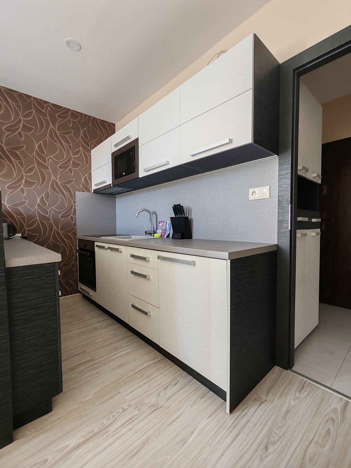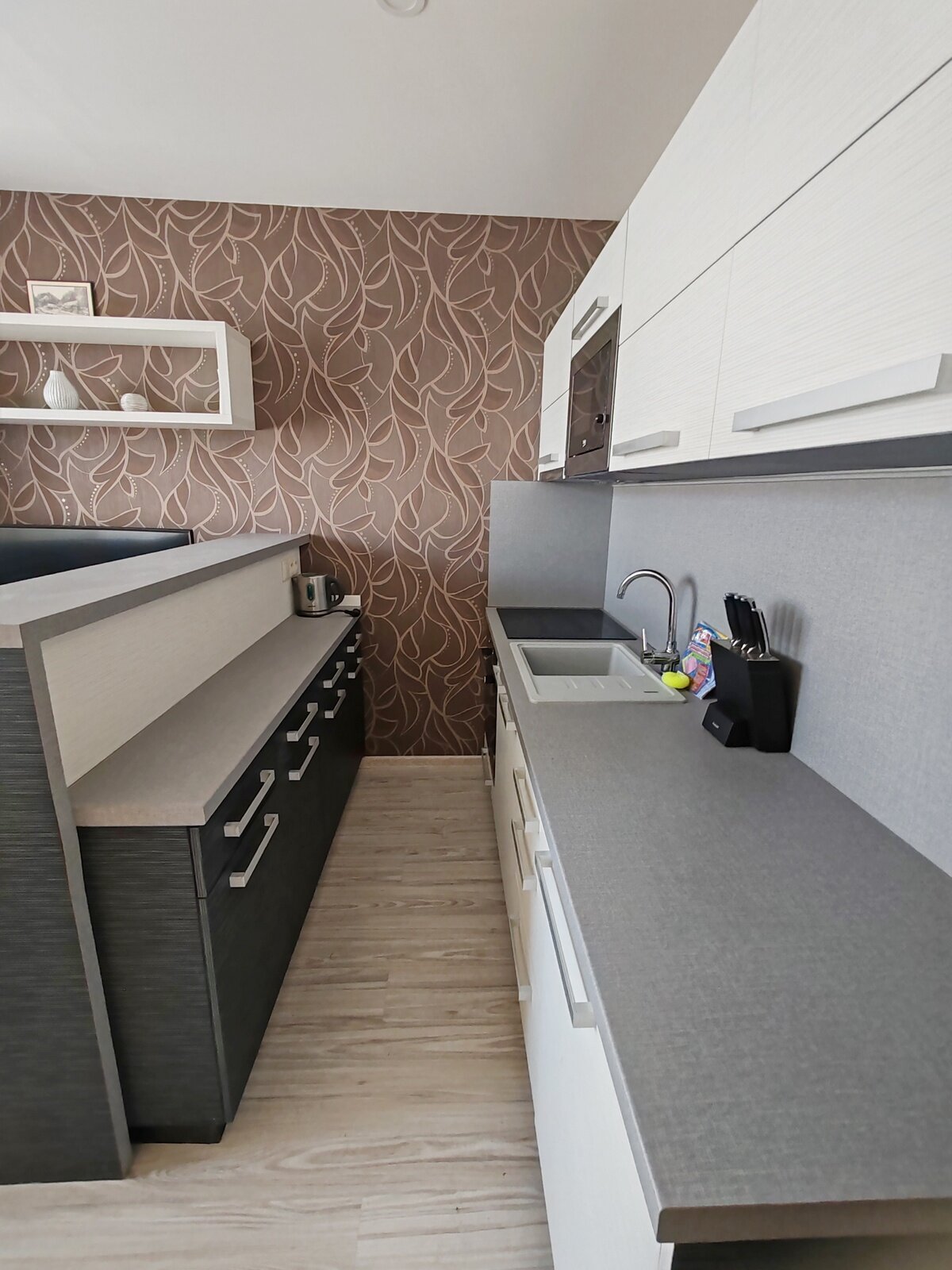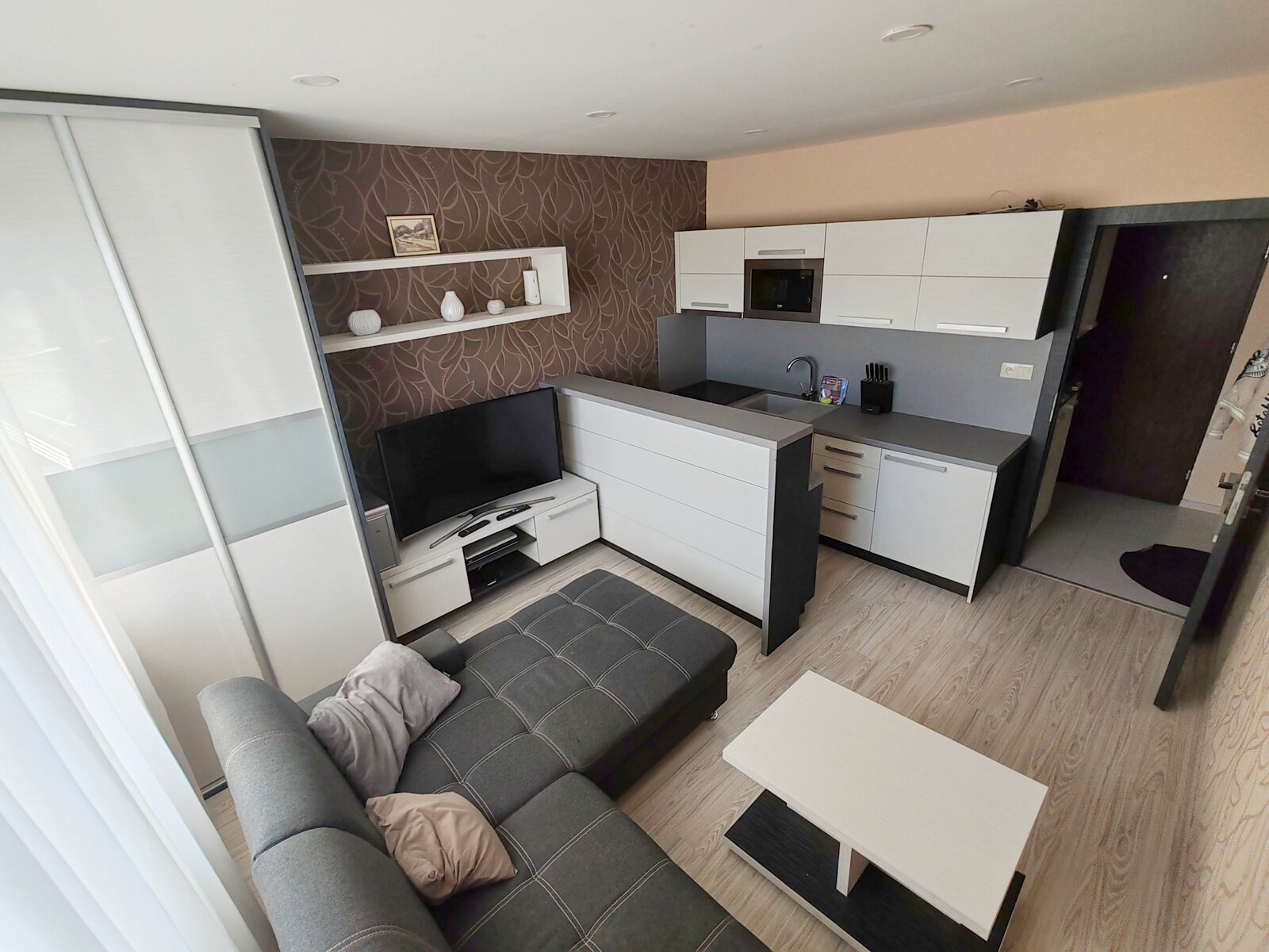 V kuchynskej linke je kompletný inventár na plnohodnotné užívanie. K dispozícii zabudovaná malá chladnička, indukčná varná doska s rúrou, digestor, mikrovlnná rúra, rychlovarná kanvica. Dostatok odkladového priestoru.