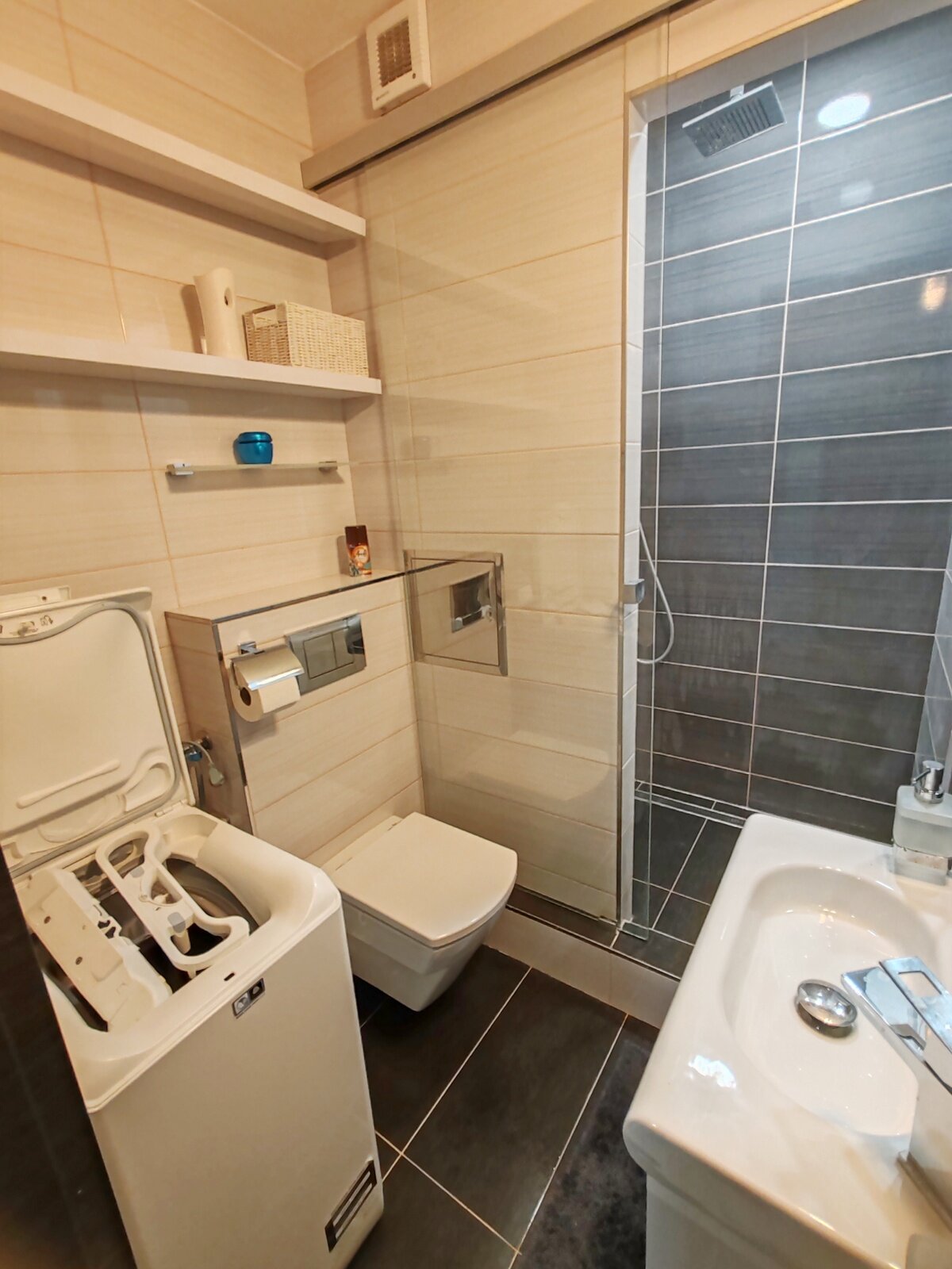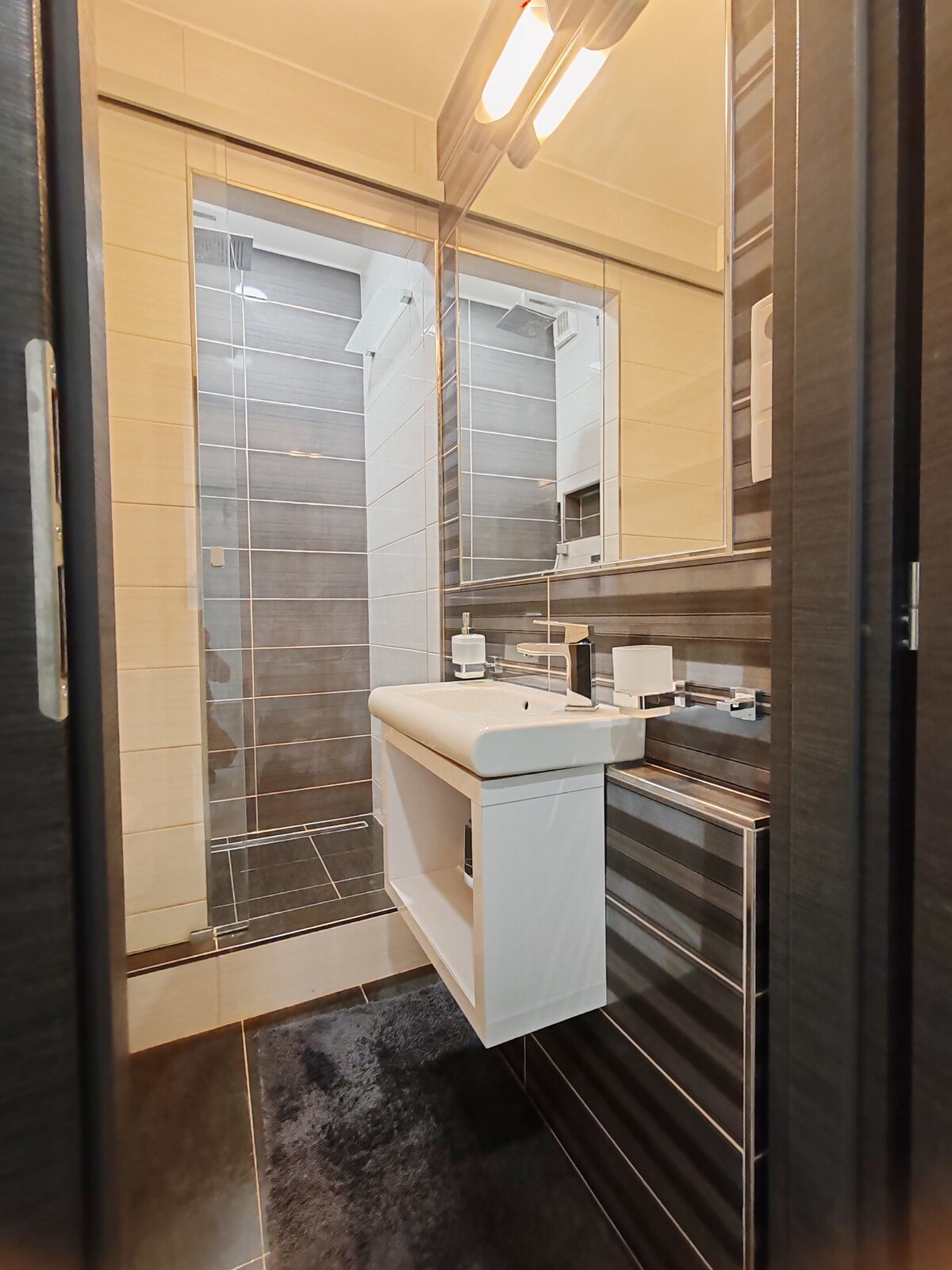 V kúpeľni murovaný sprchový kút a WC geberit – k dispozícii práčka. Chodba je osvetľovaná fotobunkou a nachádza sa tam vešiaková stena so zrkadlom, skrinka s botníkom.